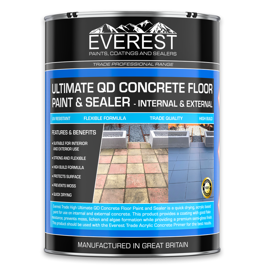 Everest Trade - Quick Drying Ultimate QD Concrete Floor Paint & Sealer is a single pack, quick-drying, low odour paint and sealer with the option added silica particles* for an effective anti-slip coating.  Designed to give a durable, easy clean protective finish to concrete interior and exterior floors, slabs and other concrete surfaces.